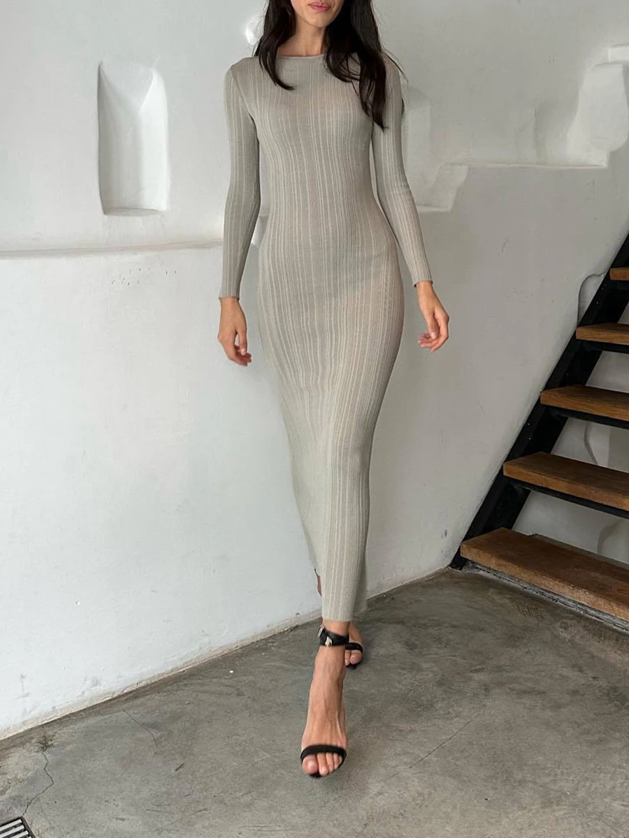 Women Spring Autumn Solid Color Bodycon Knit Dress Long Sleeve Crew Neck Ribbed Dress Slim Fit Long Dress