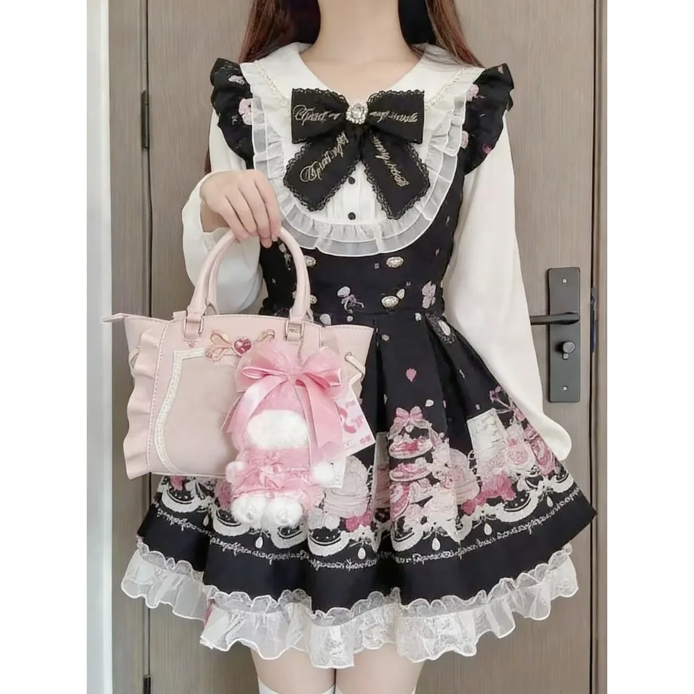 Japanese Kawaii Short Party Dress Women Chic Print Bow Thin Long Sleeve Dresses Female Design Elegant Vintage Lovely Y2k Retro