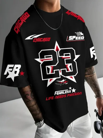 New Summer Men’s Chicago Black Red and White Printed 23 Pattern Round Neck Breathable Casual T-shirt Loose Outdoor Top